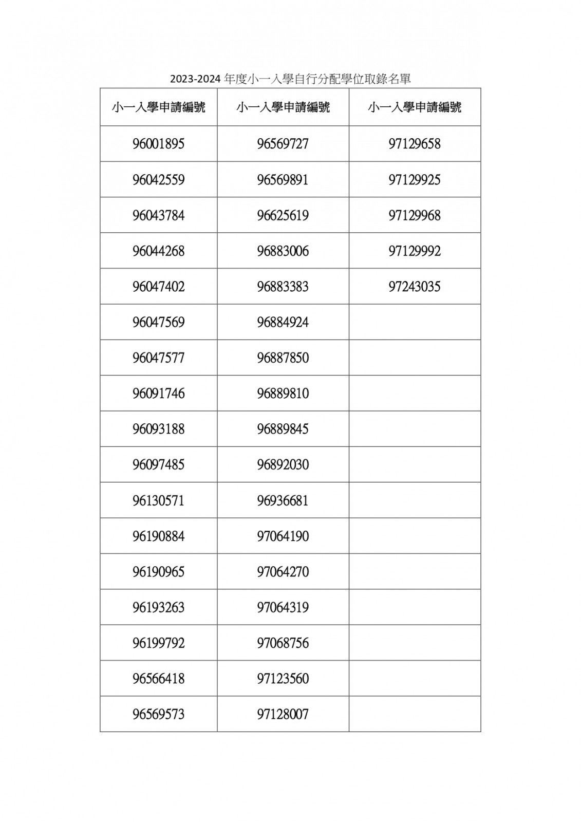 2023-2024年度小一入學自行分配學位取錄名單