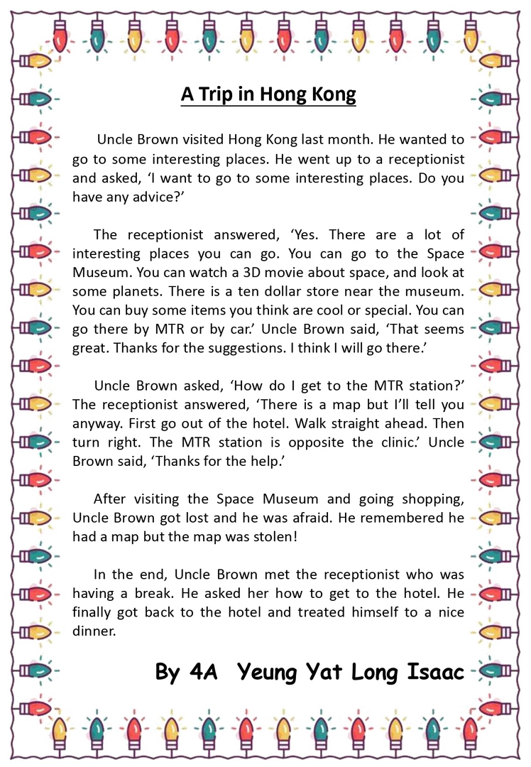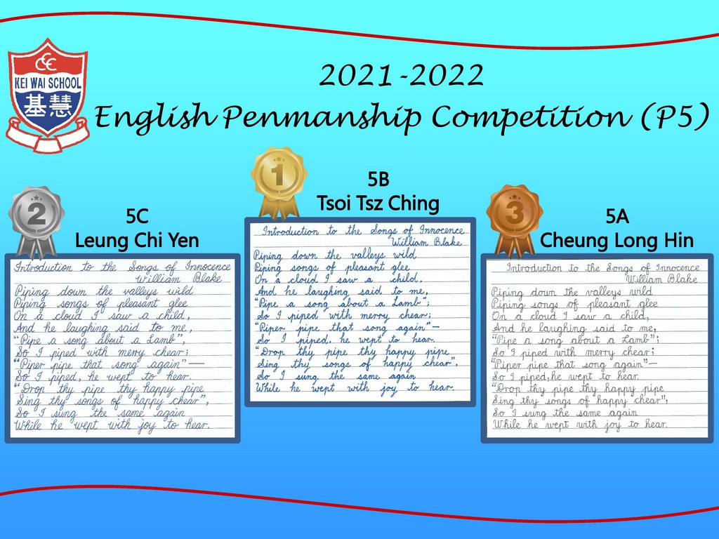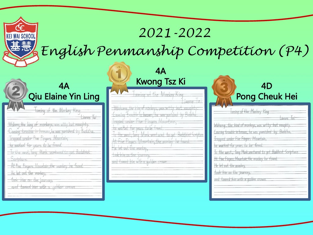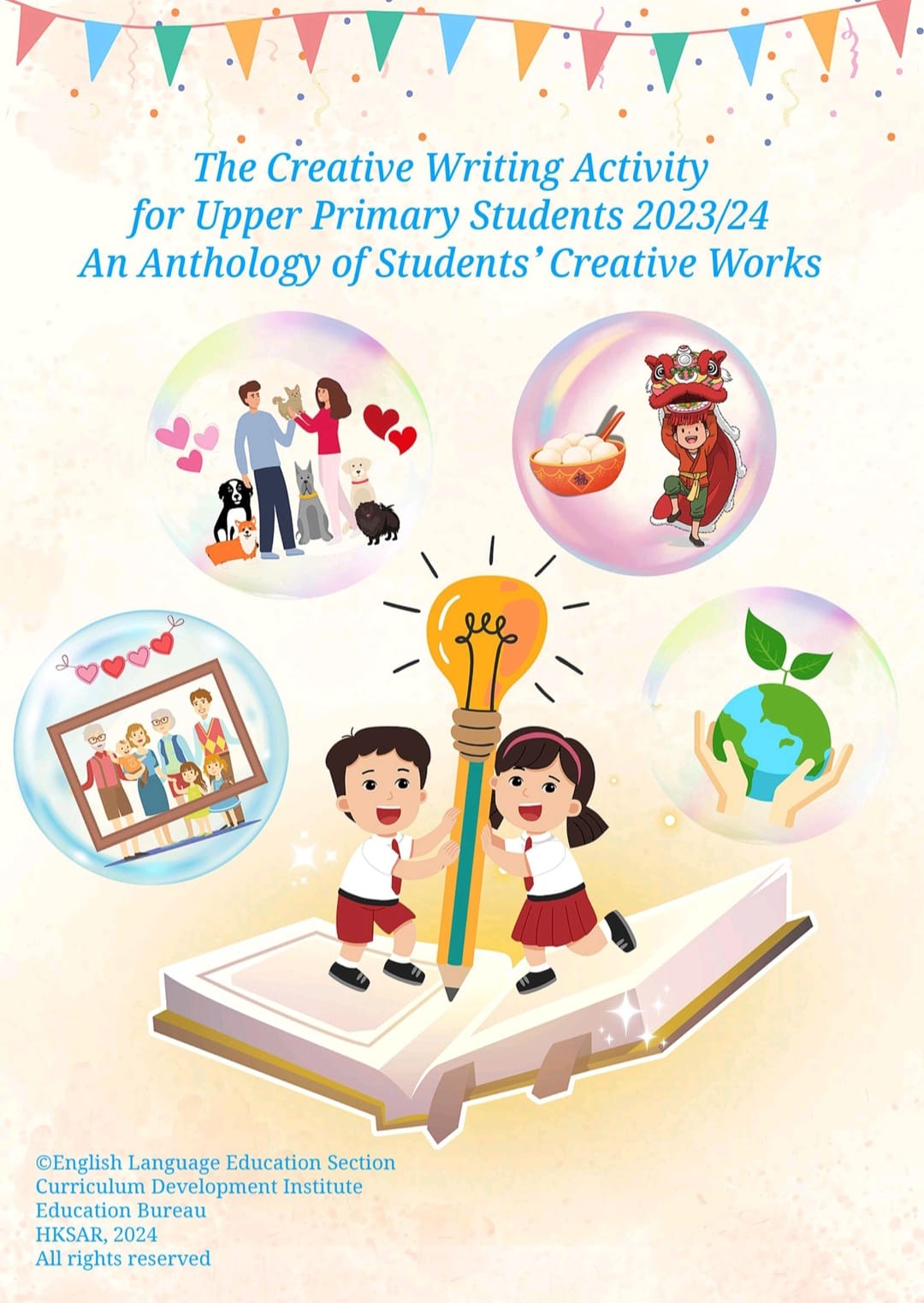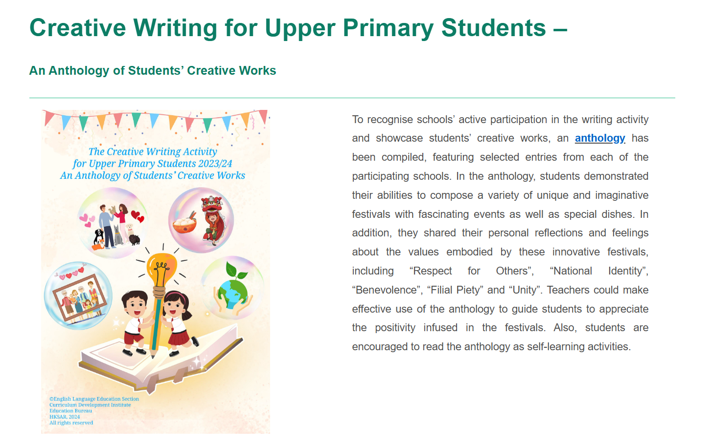 Earlier, our Primary 6 students participated in the English creative writing activity (Writing about a New Festival that Promotes Positive Values and Attitudes) organised by the English Language Education Section of the Education Bureau (ELE, EDB). After the ELE Section reviewed all the works of participating students in Hong Kong, a total of 5 articles from our school's students were selected by the organiser and compiled into an Anthology (An Anthology of Students' Creative Works) with a view to commending students for their outstanding performance.