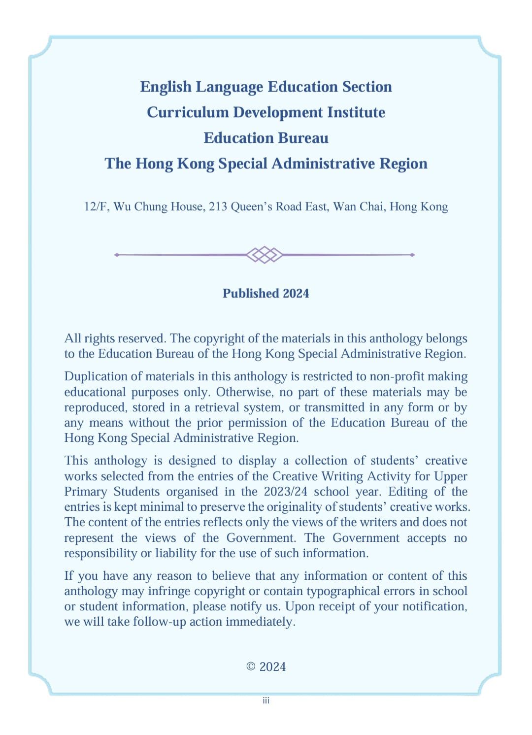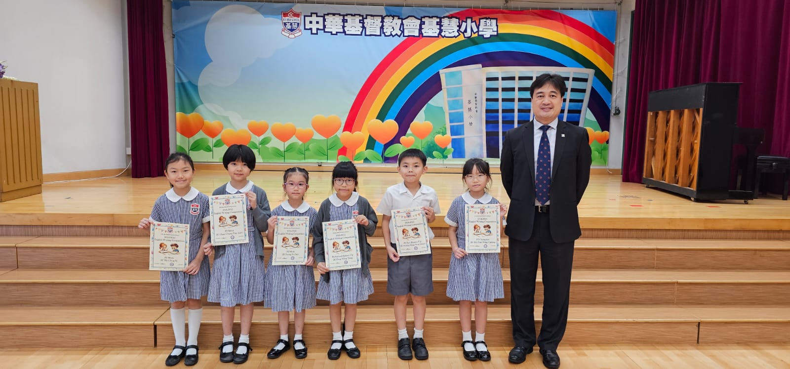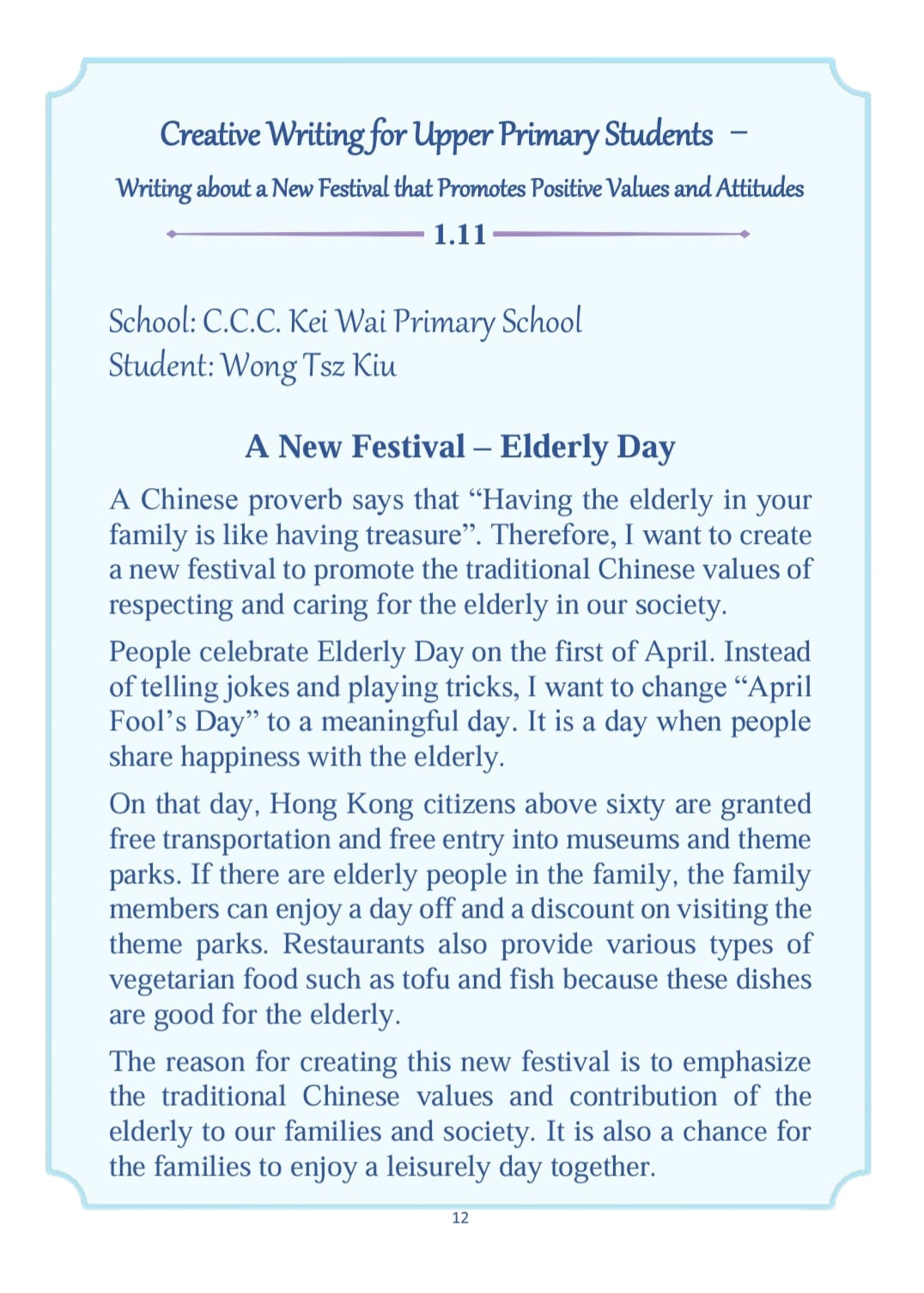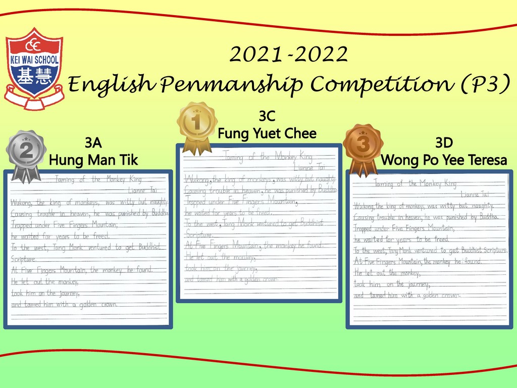 Earlier, our Primary 6 students participated in the English creative writing activity (Writing about a New Festival that Promotes Positive Values and Attitudes) organised by the English Language Education Section of the Education Bureau (ELE, EDB). After the ELE Section reviewed all the works of participating students in Hong Kong, a total of 5 articles from our school's students were selected by the organiser and compiled into an Anthology (An Anthology of Students' Creative Works) with a view to commending students for their outstanding performance.