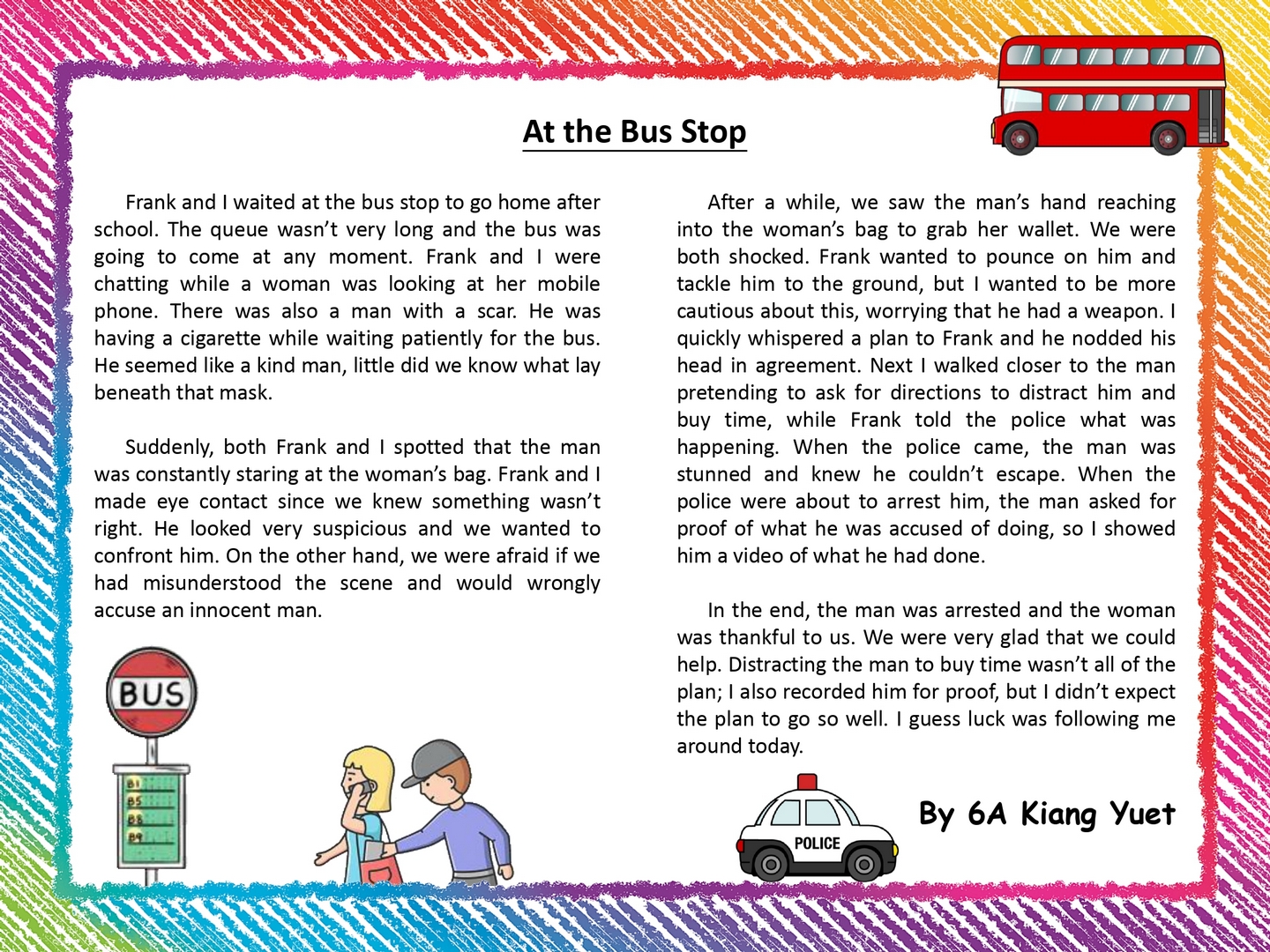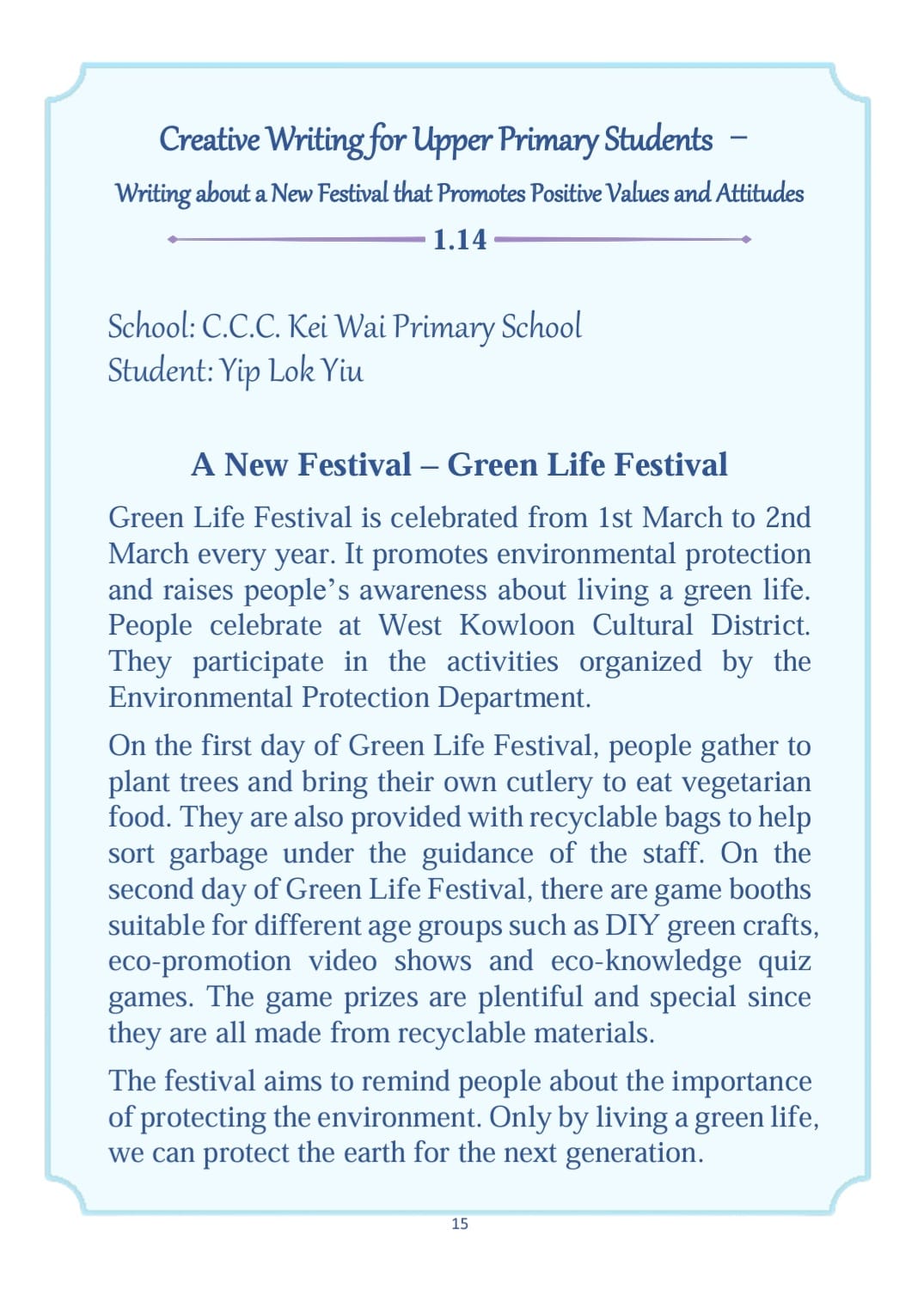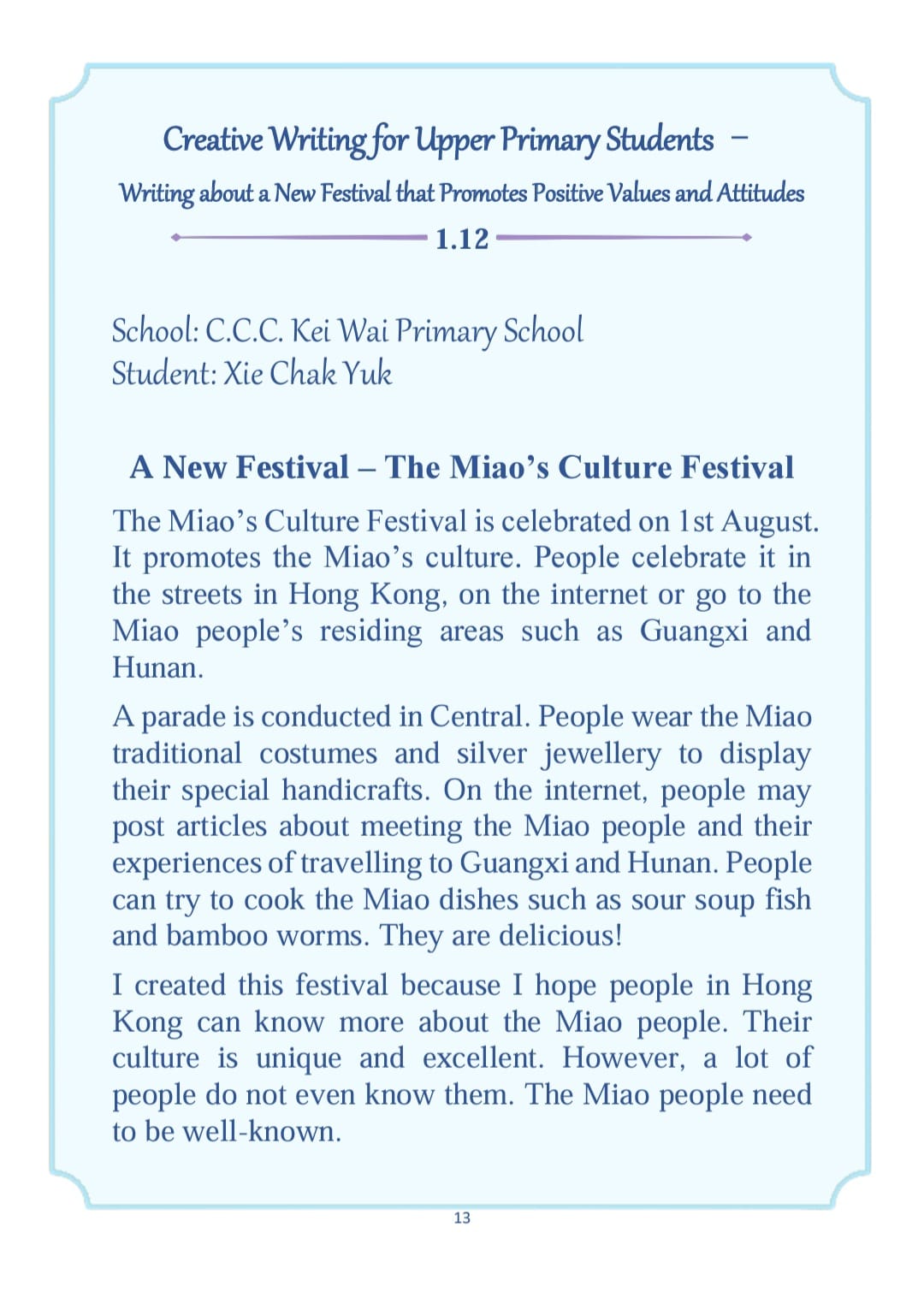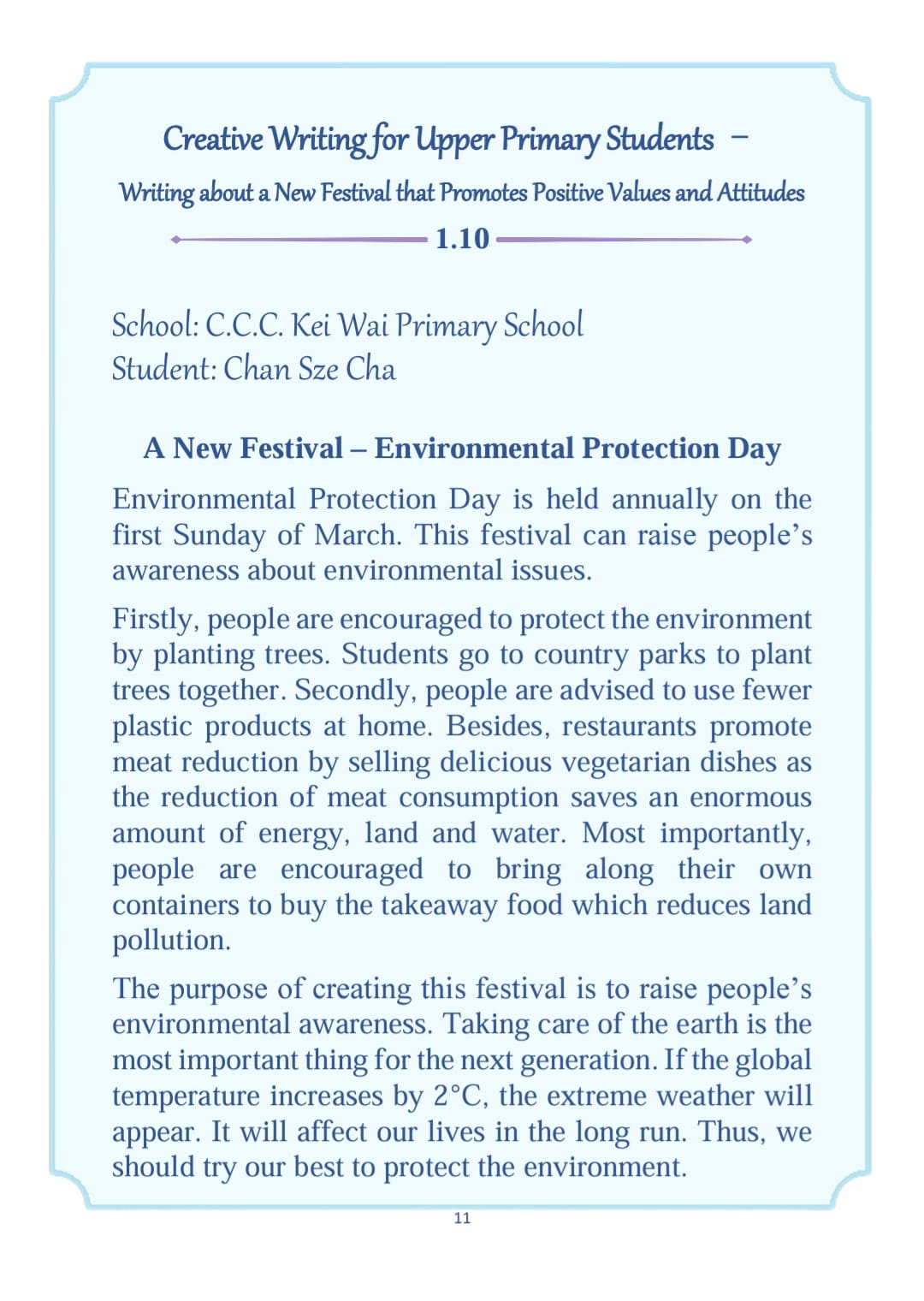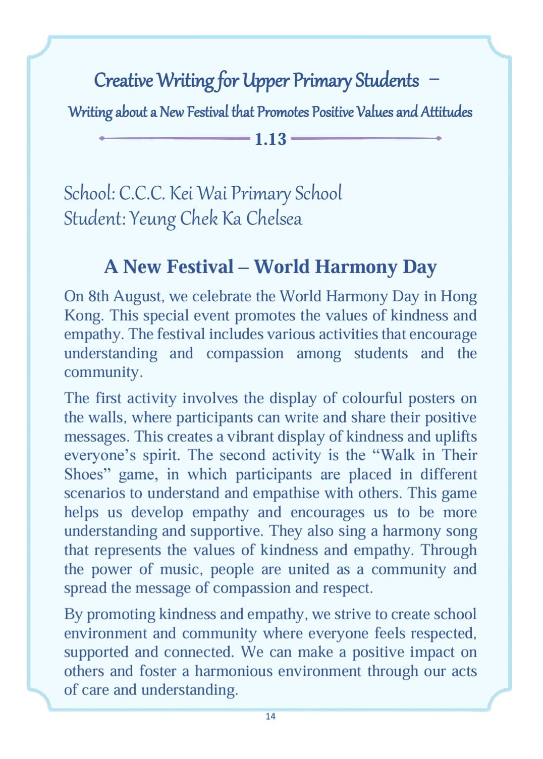 By the end of Term 1 (2023-2024), all P6 students were instructed to participate in a creative writing activity, Writing about a New Festival that Promotes Positive Values and Attitudes.