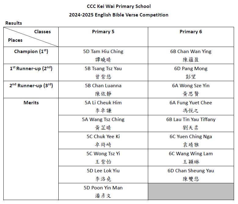 | 5B Mak Ho Yeung (16) | 5C Leung Chi Yen (13) | 5A Yeung Hei Sen (25) |